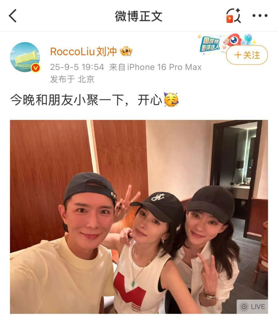 9 月 5 日晚上,刘冲发了和杨幂、张小斐的合照,配文是“今晚和一又友小聚一下,得意”,疑似暗戳戳的申诉粉丝吐槽,但却是“火上浇油”。