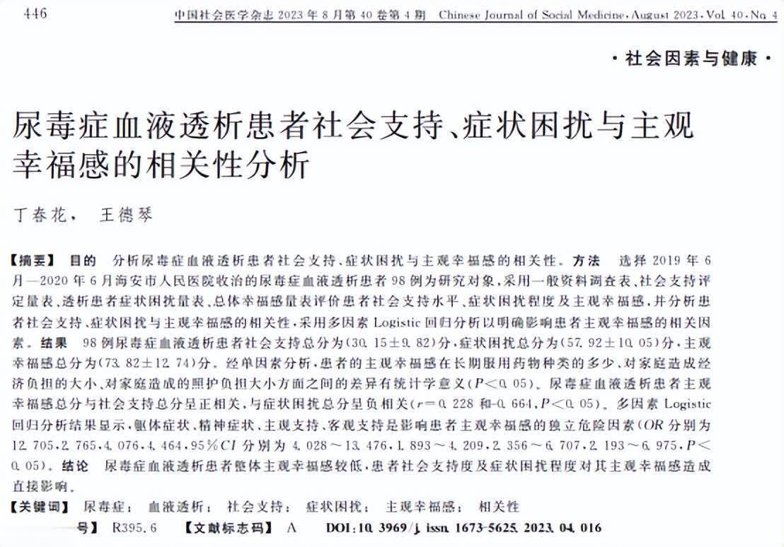参考府上:尿毒症血液透析患者社会赈济、症状困扰与主不雅幸福感的联系性分析 丁春花;王德琴 中国社会医学杂志 2023-08-15赌钱app下载